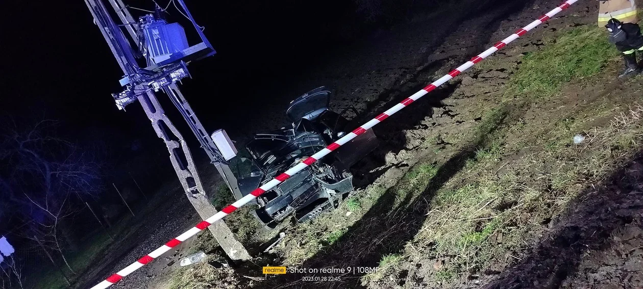 Taki był finał kolizji drogowej do której doszło w sobotę w nocy (28 stycznia) w Szczekarkowie Kolonii. O godzinie 22.20 policja dostała zgłoszenie z którego wynikało, że samochód uderzył w transformator. Auto zostało poważnie uszkodzone, transformator też.