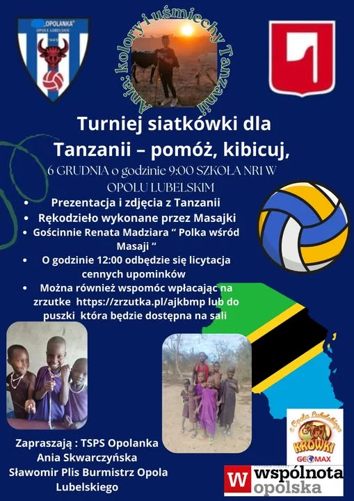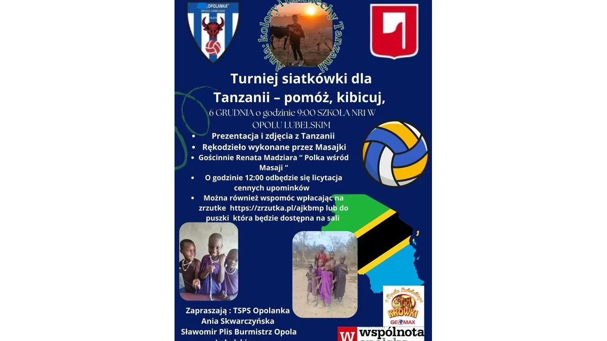 6 grudnia w Szkole Podstawowej nr 1 w Opolu Lubelskim odbędzie się wyjątkowe wydarzenie sportowo-charytatywne – Turniej Siatkówki dla Tanzanii. Organizatorzy zapraszają mieszkańców gminy i okolic do wspólnego kibicowania oraz wsparcia szczytnego celu. Start imprezy o godzinie 9:00. Podczas wydarzenia uczestnicy będą mogli obejrzeć prezentację i zdjęcia z Tanzanii, a także zapoznać się z rękodziełem przygotowanym przez Masajki. Szczególnym punktem programu będzie spotkanie z Renatą Madziarą, autorką książki „Polka wśród Masajów”, która opowie o swoich doświadczeniach i pracy w Afryce.