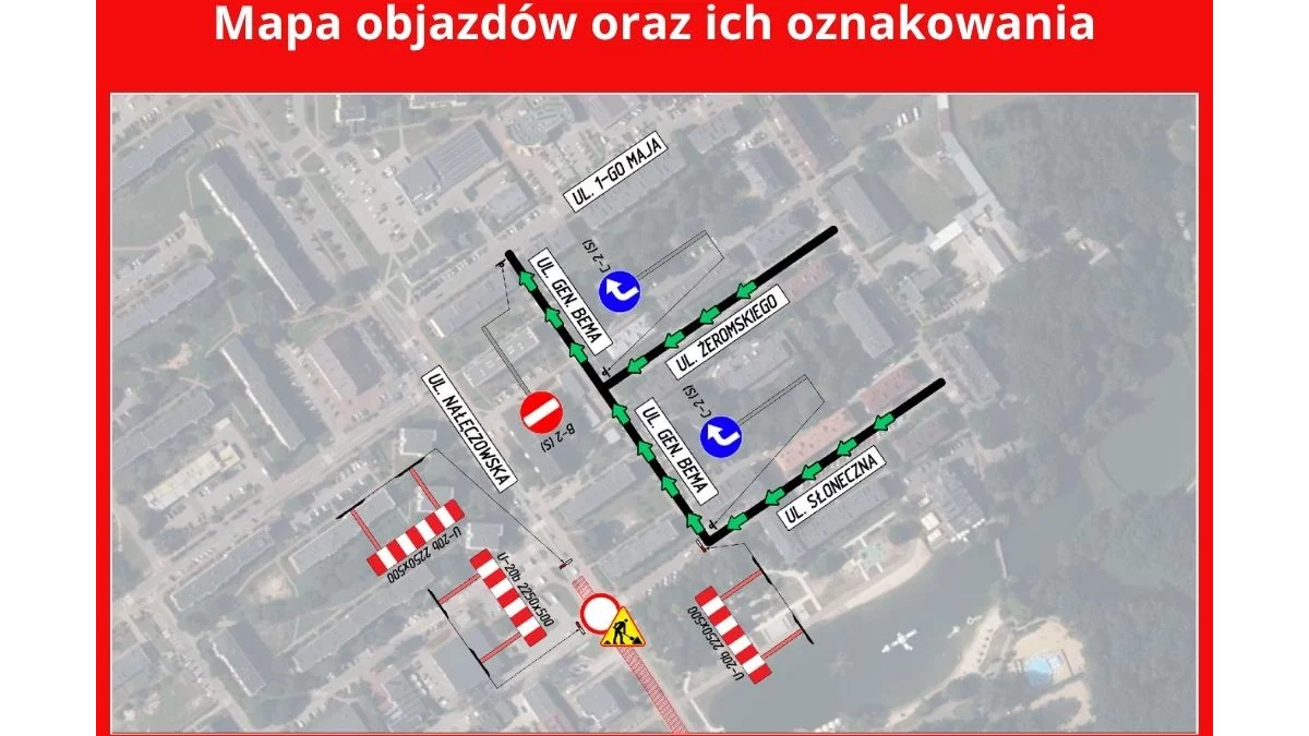 Utrudnienia spowodowane są planowanymi robotami asfaltowymi na skrzyżowaniu ulic Nałęczowska i Słoneczna. W związku z tym ruch pojazdów z ulicy Słonecznej zostanie warunkowo przekierowany na jednokierunkową ulicę Gen. Bema – z wjazdem od ul. Słonecznej oraz ul. Żeromskiego.