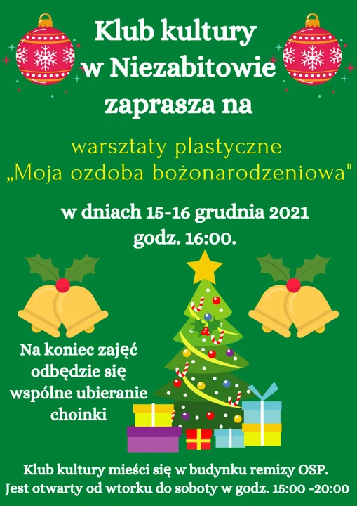 Warsztaty odbędą się 15 i 16 grudnia od godziny 16 w budynku remizy OSP, w którym mieści się niezabitowski Klub Kultury. Organizatorzy zapraszają dzieci i młodzież do wzięcia udziału w wydarzeniu. Będzie okazja do wykonania pięknych świątecznych ozdób, a na zakończenie - do wspólnego ubierania choinki.