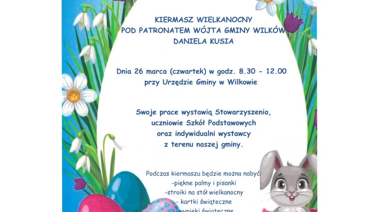 W godzinach od 8.30 do 12.00 przy Urzędzie Gminy w Wilkowie odbędzie się Kiermasz Wielkanocny organizowany pod patronatem wójta Daniela Kusia.
