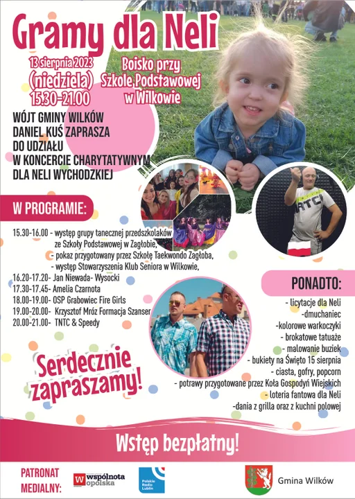 O godz. 15.30 na szkolnym boisku w Wilkowie rozpocznie się koncert charytatywny, z którego cały dochód przeznaczony jest na leczenie Neli Wychodzkiej, małej mieszkanki Piotrawina.