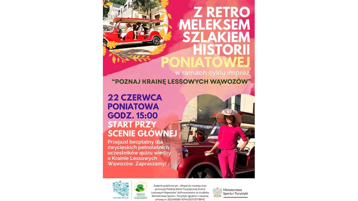 To propozycja dla miłośników historii, turystyki i nietypowych środków transportu – uczestnicy pojadą przez Poniatową stylowymi, zabytkowymi meleksami, poznając ciekawe miejsca i opowieści związane z dziejami miasta. Wyjątkowy klimat retro dopełnią stroje przewodników i dekoracje pojazdów.