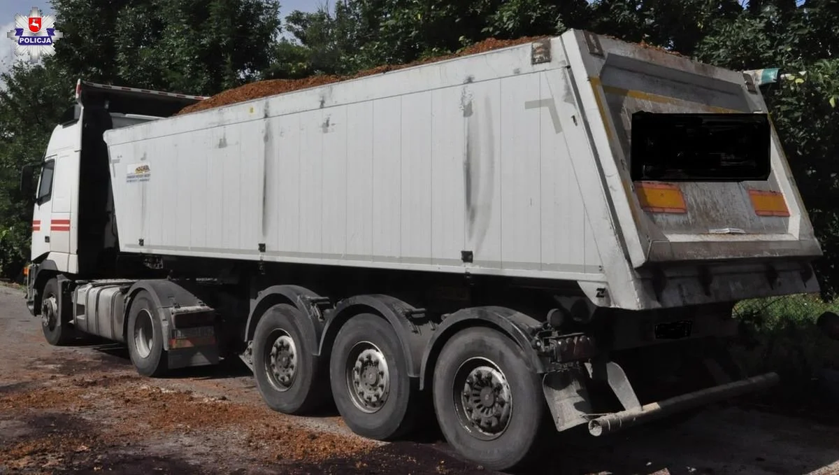 Mężczyzna przyjechał ciężarówką wraz z samowyładowczą naczepą.