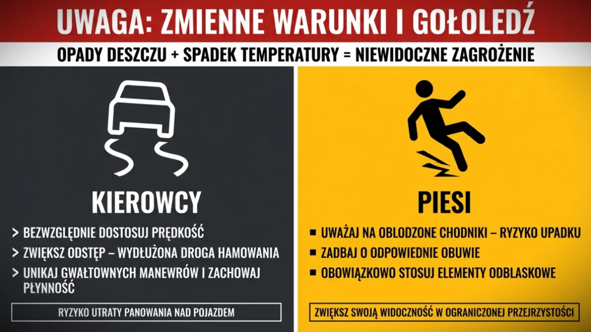 Na niebezpieczeństwo narażeni są również piesi. Mokre nawierzchnie zamarzające przy ujemnych temperaturach mogą prowadzić do groźnych upadków. Warto zadbać o odpowiednie obuwie oraz stosowanie elementów odblaskowych, które poprawiają widoczność - szczególnie po zmroku i przy ograniczonej przejrzystości powietrza.