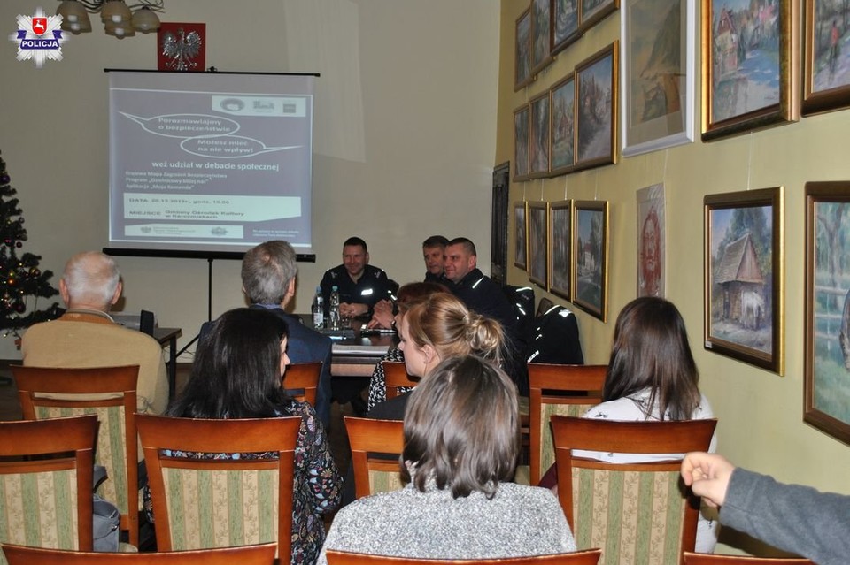 Spotkanie było okazją do wymiany pomysłów oraz doświadczeń w celu poprawy bezpieczeństwa na terenie gm. Karczmiska. Omawiano korzyści płynące z wprowadzenia Krajowej Mapy Zagrożeń Bezpieczeństwa, która stanowi wsparcie Policji na rzecz diagnozowania i zwalczania istniejących zagrożeń. Uczestnicy debaty zostali zapoznani jak w prosty sposób nanieść na mapie miejsca w których występują potencjalne zagrożenia na terenie ich gminy.