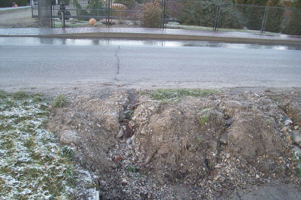 Wypłukiwane pobocze jest zasypywane kamieniami i ziemią, a to rozwiązuje problem zaledwie do następnych opadów deszczu
