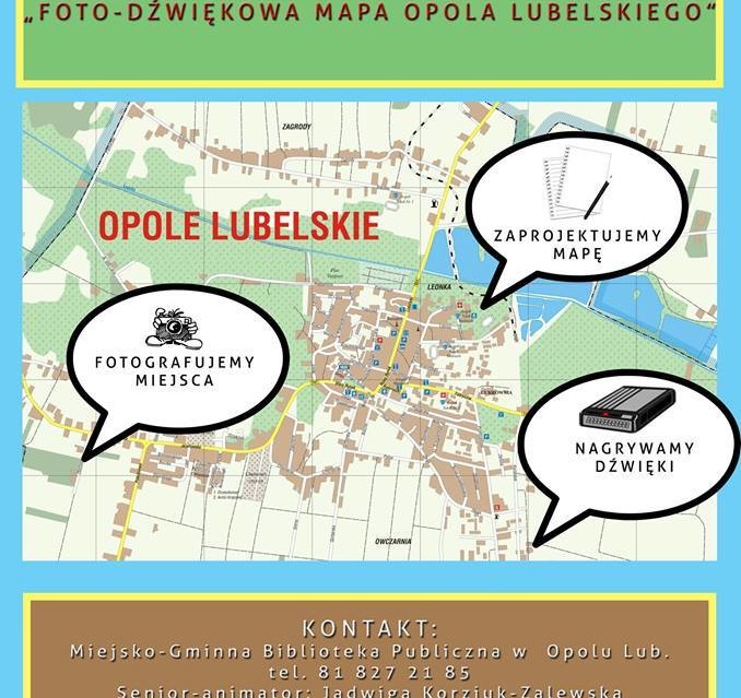 Międzypokoleniowa grupa entuzjastów zakochanych w swoim mieście rozpoczyna projekt „Foto-dźwiękowa mapa Opola Lubelskiego”. Uczestnicy poszukają ciekawych miejsc, które warto uwiecznić. Zorganizują plenery fotograficzne oraz spacery „dźwiękowe”. Potrzebne do tych działań umiejętności zdobędą na warsztatach prowadzonych przez ekspertów. Efektem spotkań będzie stworzenie mapy miasta, jakiej do tej pory nie było – dzięki niej popatrzymy miastu w oczy i podsłuchamy je. Uczestnicy projektu zaprezentują ją na utworzonej w tym celu stronie internetowej, zorganizują pokaz w przestrzeni miejskiej i w kinie. Miejsce w zespole znajdzie się dla każdego!