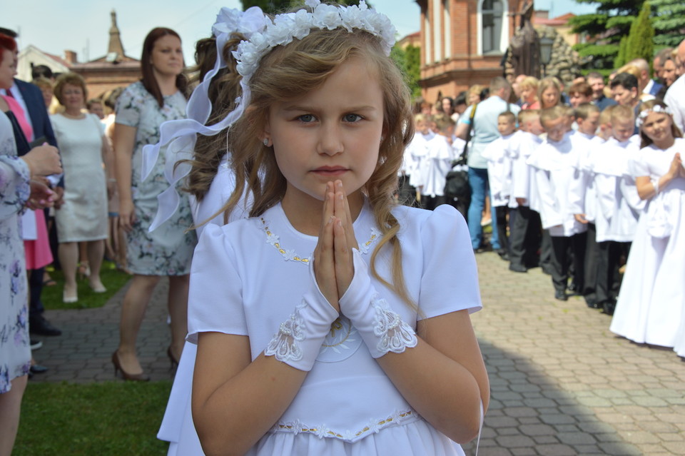 W Chodlu – tak jak w innych miejscowościach powiatu – dzieci do komunii szły w jednakowych strojach. Dziewczynki w białych długich sukienkach, chłopcy w albach i czarnych spodniach.