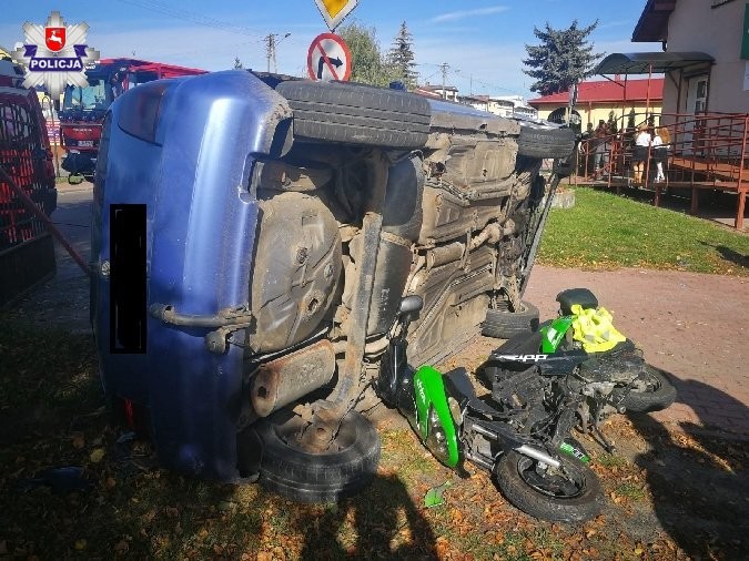 Do zdarzenia doszło w wczoraj w Chodlu na skrzyżowaniu o ruchu okrężnym. Skierowani na miejsc policjanci ustalili, że kierujący volkswagenem 41-letni mężczyzna z gm. Chodel zjeżdżając z ronda najechał na słupek przeszkodowy uszkadzając oponę w swoim samochodzie. Mężczyzna stracił panowanie nad pojazdem. Uderzył w stojący na chodniku motorower, który wepchnął na teren posesji przy ul. Mostowej, a następnie sam dachował. Na szczęście stojący przy motorowerze dwaj mężczyźni zdążyli odskoczyć od motoroweru unikając potrącenia.