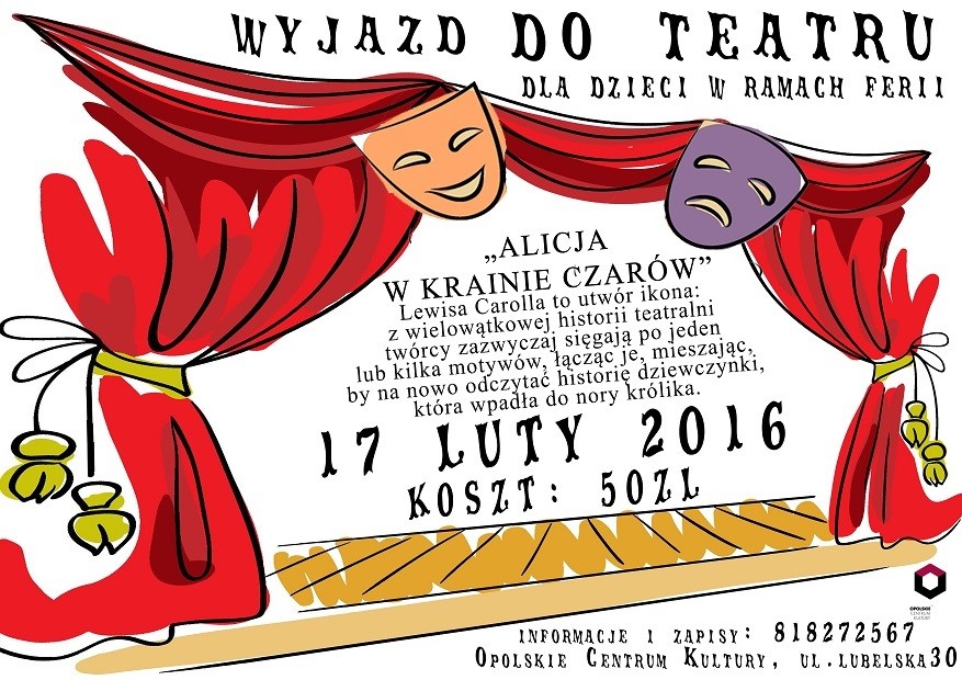 OCK w Opolu Lubelskim zaprasza dzieci na organizowany wyjazd do Teatru Andersena na spektakl pt. "Alicja w krainie czarów", który odbędzie się w środę, 17 lutego 2016 r. Koszt wyjazdu: 50 zł.