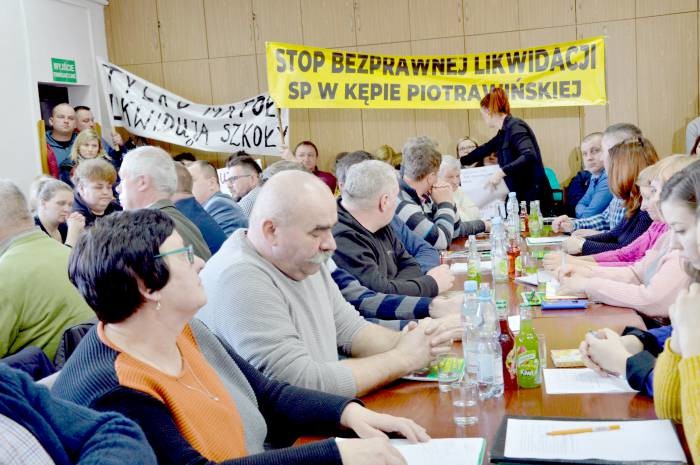 Na sesji pojawiło się kilkudziesięciu rodziców uczniów Szkoły Podstawowej w Kępie Piotrawińskiej. To ta placówka wybrana została przez wójta i radnych do likwidacji. Rodzice przyszli z transparentami, aby wyrazić swoje niezadowolenie. Apelowali też do włodarzy o opamiętanie się.