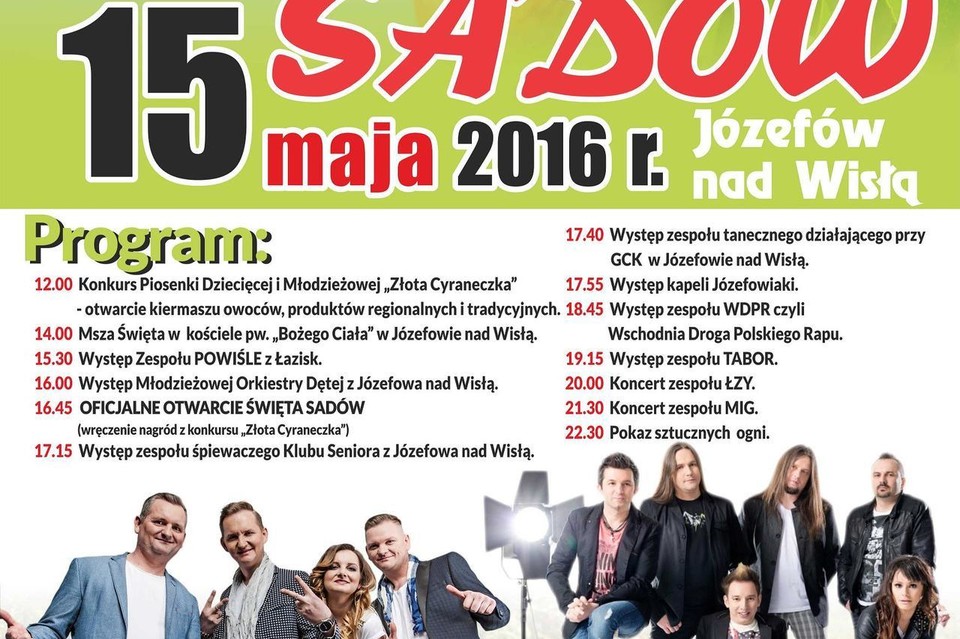Impreza odbędzie się 15 maja 2016 r. Rozpocznie się konkursem Orkiestry Dziecięcej i Młodzieżowej „Złota cyraneczka" (godz. 12:00). Dwie godziny później w miejscowym kościele zostanie odprawiona msza święta w intencji sadowników.