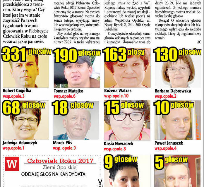 Aby oddać głos na wybranego kandydata należy wysłać sms na numer 72051 o treści wskazanej przy nazwisku kandydata. Koszt jednego sms-a to 2,46 z VAT. Kupony należy wyciąć, wypełnić i dostarczyć do naszej redakcji - osobiście lub wysłać pocztą na adres: Wspólnota Opolska, ul. Nowy Rynek 2, 24 - 300 Opole Lubelskie.