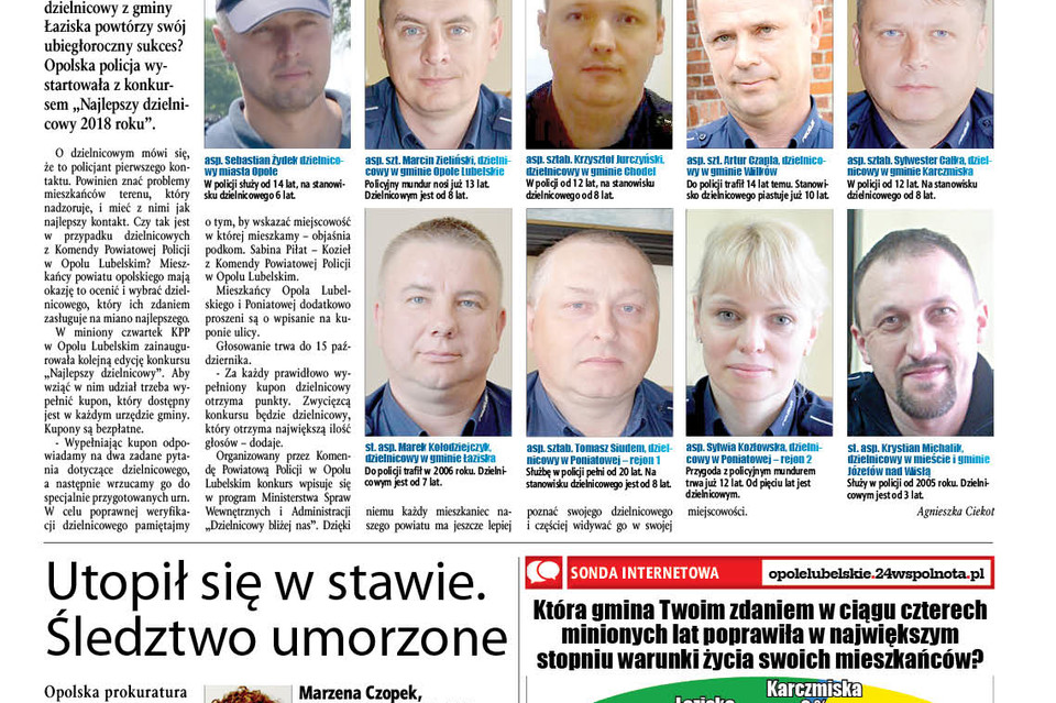 O dzielnicowym mówi się, że to policjant pierwszego kontaktu. Powinien znać problemy mieszkańców terenu, który nadzoruje, i mieć z nimi jak najlepszy kontakt. Czy tak jest w przypadku dzielnicowych z Komendy Powiatowej Policji w Opolu Lubelskim? Mieszkańcy powiatu opolskiego mają okazję to ocenić i wybrać dzielnicowego, który ich zdaniem zasługuje na miano najlepszego.