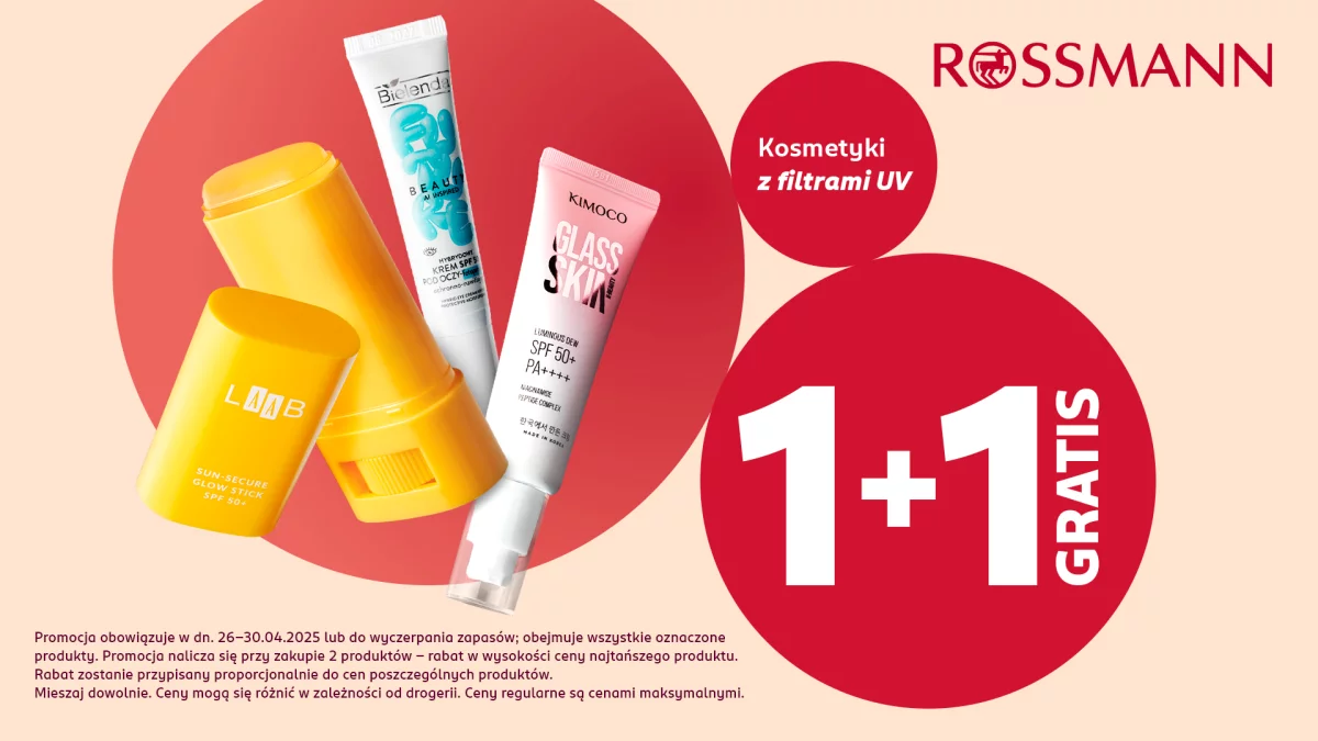 Promocją 1+1 na kosmetyki z filtrem UV objętych są setki produktów. Wybierz najlepiej dopasowane do twoich potrzeb w swojej ulubionej drogerii lub pod tym linkiem. Oferta obowiązuje do 30 kwietnia lub do wyczerpania zapasów.