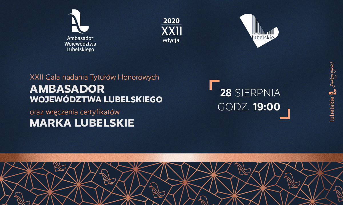 Gala XXII edycji honorowego tytułu "Ambasador Województwa Lubelskiego” oraz certyfikatów Marka Lubelskie odbędzie się w sobotę (28 sierpnia) o godz. 19.00 w Centrum Spotkania Kultur w Lublinie. Wydarzenie będzie można oglądać na żywo, od godz. 19.00 na antenie TVP 3 Lublin i na profilu Facebook Urzędu Marszałkowskiego Województwa Lubelskiego oraz LubelskiePL.